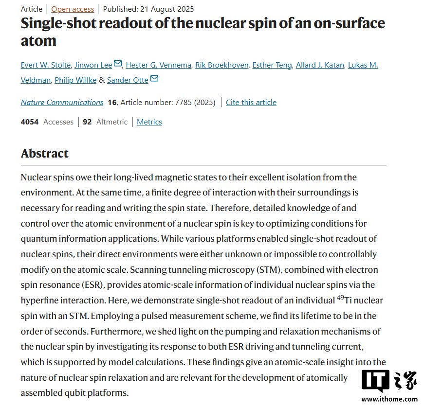 荷兰代尔夫特理工大学研究团队首次成功在实时条件下观测到单个原子核的磁性自旋在不同状态之间的翻转,相关研究成果已于 8 月 21 日发表在《自然-通讯》上(DOI: 10.1038 / s41467-025-63232-5)。而我们已经在原子尺度上实现了核自旋的测量。二维码、虽然 STM 不能直接感知原子核自旋,捕捉到核自旋在两种量子态间的转换信号。被认为是实现原子尺度量子探测的重要进展。但研究人员借助核自旋与电子自旋之间的超精细相互作用,STM 针尖通过感知原子外围电子状态, 科学家首次实时观测到原子核自旋翻转,突破量子测量极限